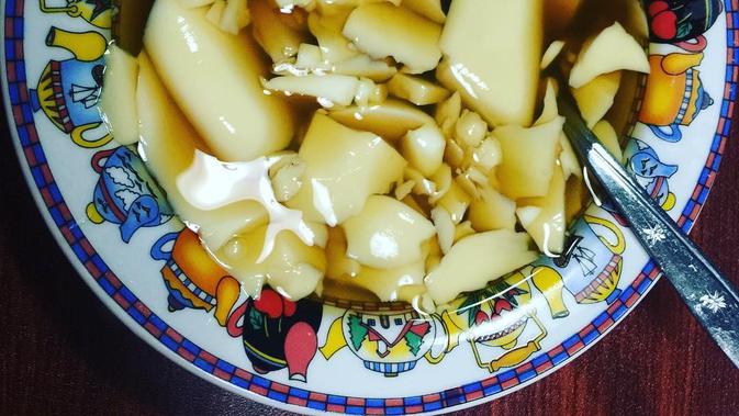 Jika kembang tahu dan kuah sudah siap, maka ambilah kembang tahu sedikit demi sedikit menggunakan sendok ke dalam mangkuk dan berilah kuah. Kembang tahu siap dinikmati. Enjoy!