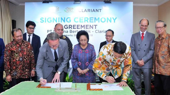 Liputan6.com, Jakarta - Untuk meningkatkan kinerja ekspor Indonesia, PT Martina Berto dan Clariant sepakat bekerja sama mempromosikan ekspor produk-produk domestik Indonesia. Penandatangan kerja sama kedua perusahaan itu bertepatan dengan Hari Kesaktian Pancasila pada 1 Oktober 2018 di Hotel Century Atlet Jakarta.