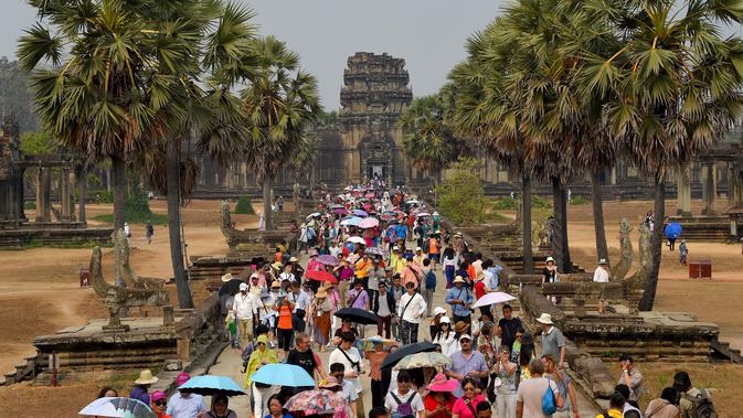 Turis mengunjungi candi Angkor Wat di provinsi Siem Reap, barat laut Kamboja pada 16 Maret 2019. Angkor Wat terkenal memiliki lebih dari 3000 Apsaras, relief berwujud perempuan, yang dipahat di setiap dindingnya. (TANG CHHIN Sothy / AFP)