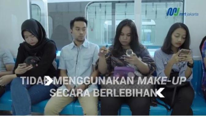Liputan6.com, Jakarta - Pihak MRT Jakarta kembali mengeluarkan video terbaru yang berisi panduan menumpang moda transportasi terbaru itu, yakni video "5 panduan Perilaku di transportasi Publik", Jumat, 15 Maret 2019. Dalam video tersebut disebutkan salah satu aturannya ialah tidak menggunakan makeup secara berlebihan.