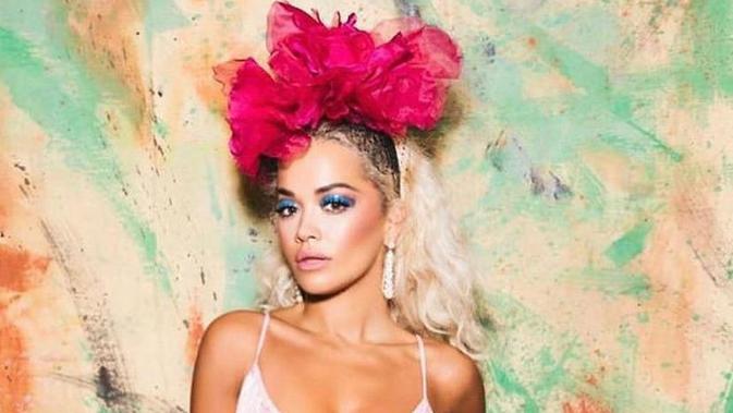 Dalam potret tersebut, Rita Ora tampak dalam balutan mini dress pink dengan belahan dada rendah. Sambil berpose, ia juga mengenakan hiasan kepala shocking pink dan anting-anting panjang karya Rinaldy.