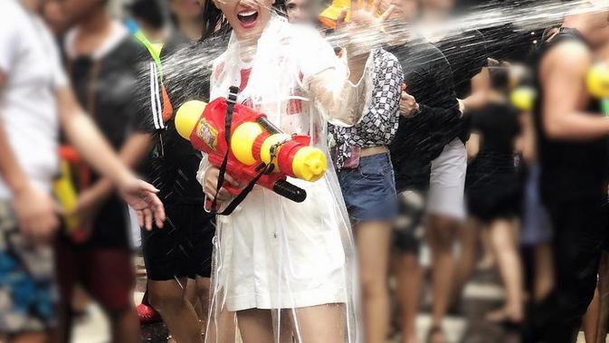 Warga Thailand ramai-ramai melakukan pesta air bersama warga yang lain. Mereka membaur dan menyatu merayakan acara tersebut dengan penuh kegembiraan, termasuk wisatawan lainnya, seperti diikuti Ririn Ekawati.
