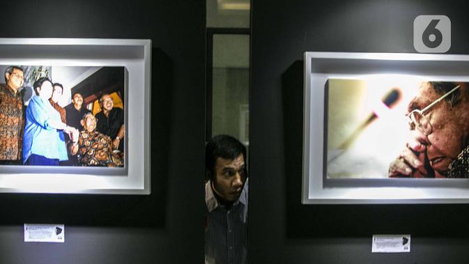 Pengunjung melihat-lihat foto pada pameran Satu Dekade Haul Presiden ke IV Republik Indonesia KH Abdurrahman Wahid atau Gus Dur di Kantor DPP PKB, Jakarta, Rabu (15/1/2020). Pameran sekaligus lomba foto ini diikuti oleh puluhan fotografer dari seluruh Indonesia. (Liputan6.com/Faizal Fanani)