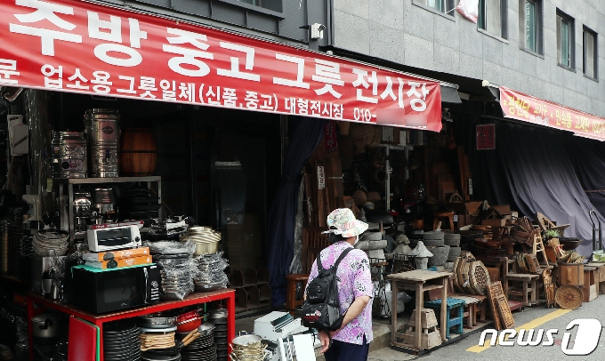 (서울=뉴스1) 김명섭 기자 = 신종 코로나바이러스 감염증(코로나19) 재확산으로 외식업계에 폐업은 많아도 창업은 없는 가운데 30일 서울 중구 황학둥 주방거리에 중고 주방 용품들이 놓여져 있다. 2020.8.30/뉴스1