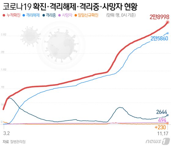 국내 신규 확진자 추이는 0시 기준, 지난 11월 4일부터 11월 17일까지(2주간) '118→125→145→89→143→126→100→146→143→191→205→208→223→230명' 순으로 나타났다.