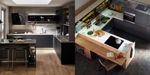 우리나라 아파트에서 널리 사용되는 ㄱ자형 주방(왼쪽)은 가장 무난한 구조다. 평수가 넓은 경우에는 ㄷ자형 주방(오른쪽)이 많이 사용된다. ⓒ 한샘