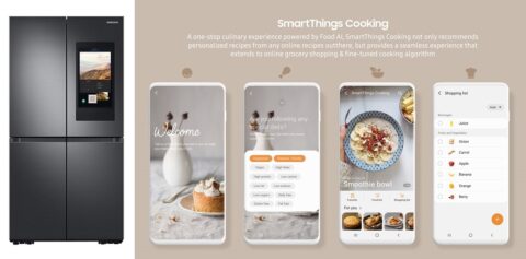 올해 1월 열린 세계 최대 전자 전시회 ‘CES 2021’에서 선보인 삼성전자의 패밀리허브(왼쪽)와 스마트싱스 앱(오른쪽). 사용자의 취향에 맞는 식단과 조리법을 추천하고 보관 중인 식료품 관리를 도와준다. ⓒ 삼성전자