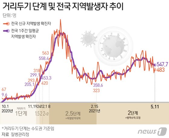 지역발생 사례는 483명, 해외유입 사례는 28명이다. 1주간 지역 평균 확진자는 547.7명으로 전날 552.1명보다 4.4명 줄었다. 11일째 500명대를 유지했으며, 62일째 사회적 거리두기 2.5단계(1주간 지역발생 일평균 400~500명 이상) 수준에 부합했다.