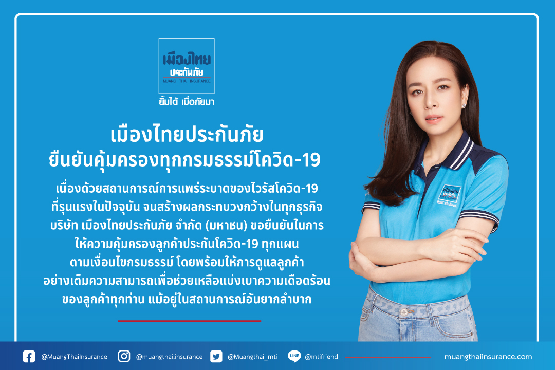 วันที่ 16 กรกฎาคม 2564 นางนวลพรรรณ ล่ำซำ กรรมการผู้จัดการ และประธานเจ้าหน้าที่บริหาร บริษัท เมืองไทยประกันภัย จำกัด (มหาชน) เปิดเผยว่า เนื่องด้วยสถานการณ์การแพร่ระบาดของไวรัสโควิด-19 ที่รุนแรงในปัจจุบัน จนสร้างผลกระทบวงกว้างในทุกธุรกิจ บริษัทขอยืนยันในการให้ความคุ้มครองลูกค้าประกันโควิด-19 ทุกแผนตามเงื่อนไขของกรมธรรม์ โดยพร้อมให้การดูแลลูกค้าอย่างเต็มความสามารถ เพื่อช่วยเหลือแบ่งเบาความเดือดร้อนของลูกค้าทุกท่าน ให้อุ่นใจแม้อยู่ในสถานการณ์อันยากลำบาก