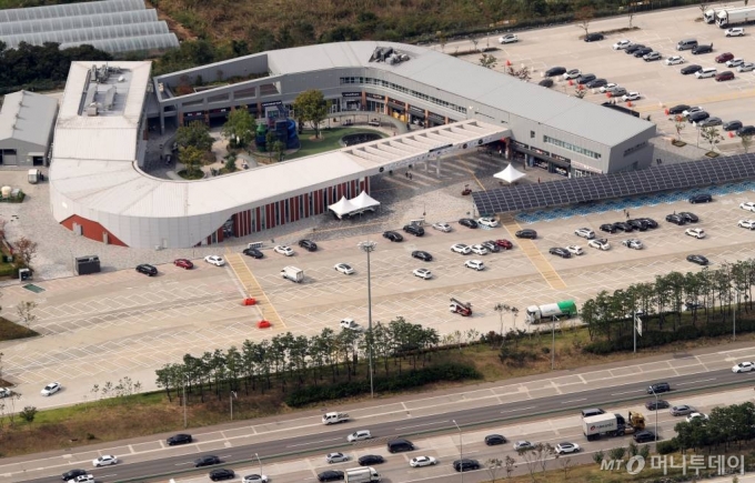 | 추석 연휴를 하루 앞둔 29일 오후 경기 평택시 서해안고속도로 매송 휴게소에 귀성길에 오른 차량들이 정차하고 있다. /사진=평택(경기)=김휘선 기자 hwijpg@ |
