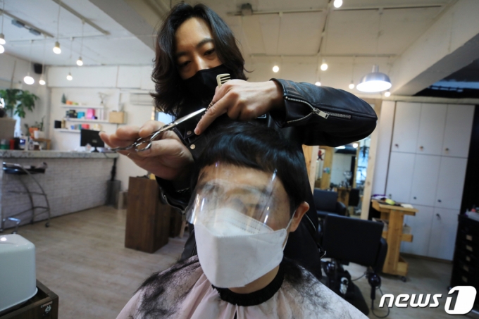 | (서울=뉴스1) 구윤성 기자 = 20일 서울 마포구 라이언스타일 미용실에서 헤어디자이너가 고객에게 신종 코로나바이러스 감염증(코로나19) 예방을 위해 마스크와 페이스필름을 씌우고 커트를 하고 있다. 2020.3.20/뉴스1 |