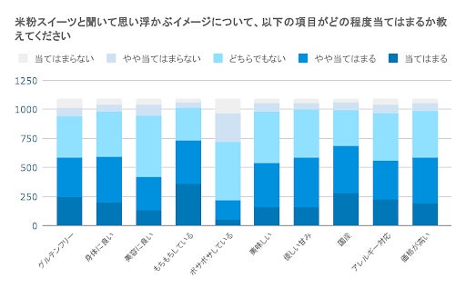 米粉で作ったスイーツと聞いて思い浮かぶイメージは、「もちもちしている」「国産」が最も多く、次いで「身体に良い」「優しい甘み」「グルテンフリー」「価格が高い」が多く挙げられました。